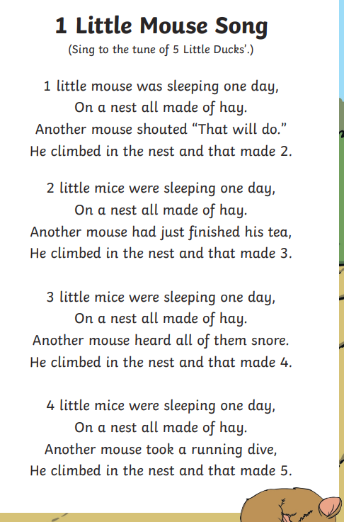 Reception children will be looking at matching objects, learning nursery rhymes, ordering numbers to 10, making patterns like ABAB- teddy, frog, teddy, frog, learning how to sort objects by features like colour and shape, compare length and height by building towers, looking at height of children and whether objects are big or small, comparing groups of objects and talking about which group has more and which has less, looking at one ot one correspondence- does each child have a snack? Everyday we count how many children are in our class and write down the number on our maths display. We will have fun opportunities to do baking cupcakes and making playdough, using weighing scales and measuring liquids and talking about quantities of each ingredient.