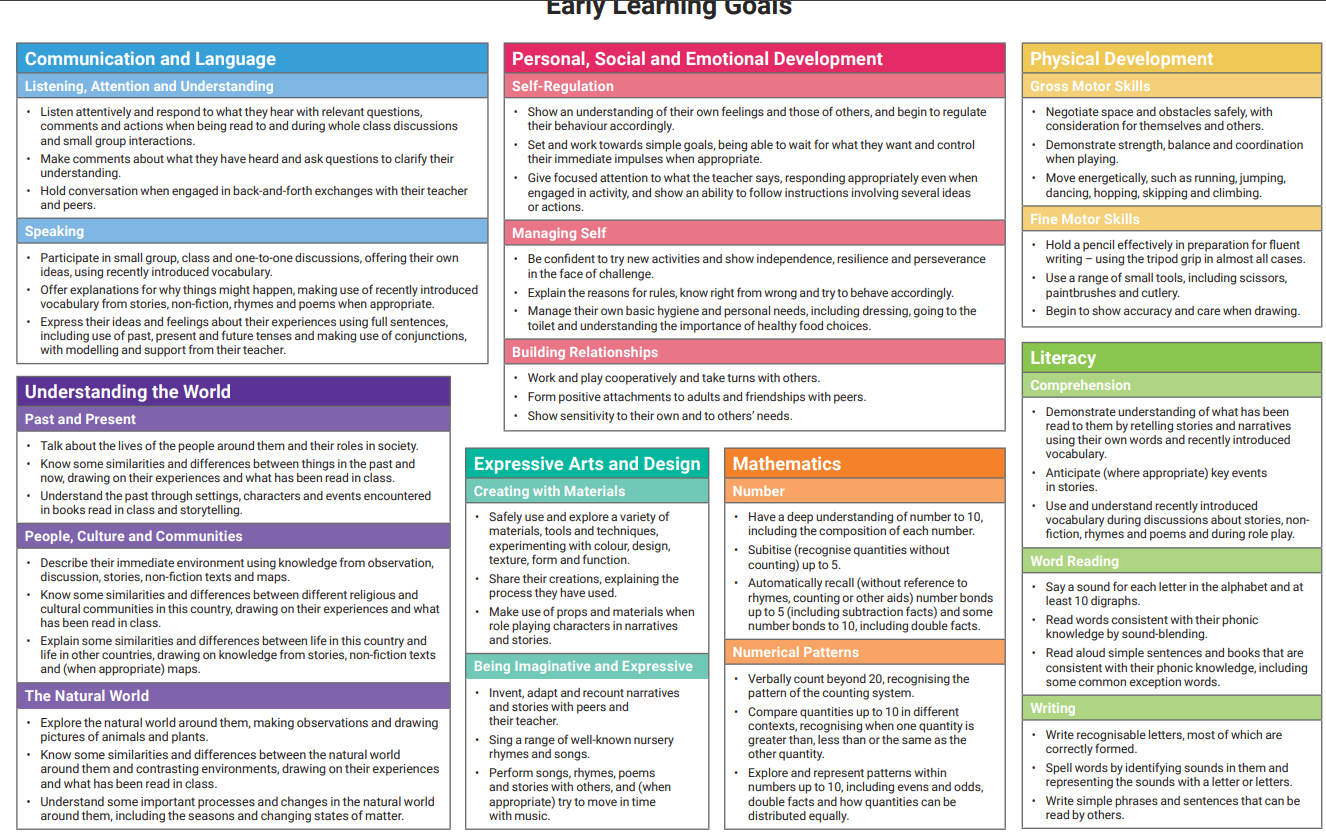 Our Early Learning Goals for the end of Reception year: